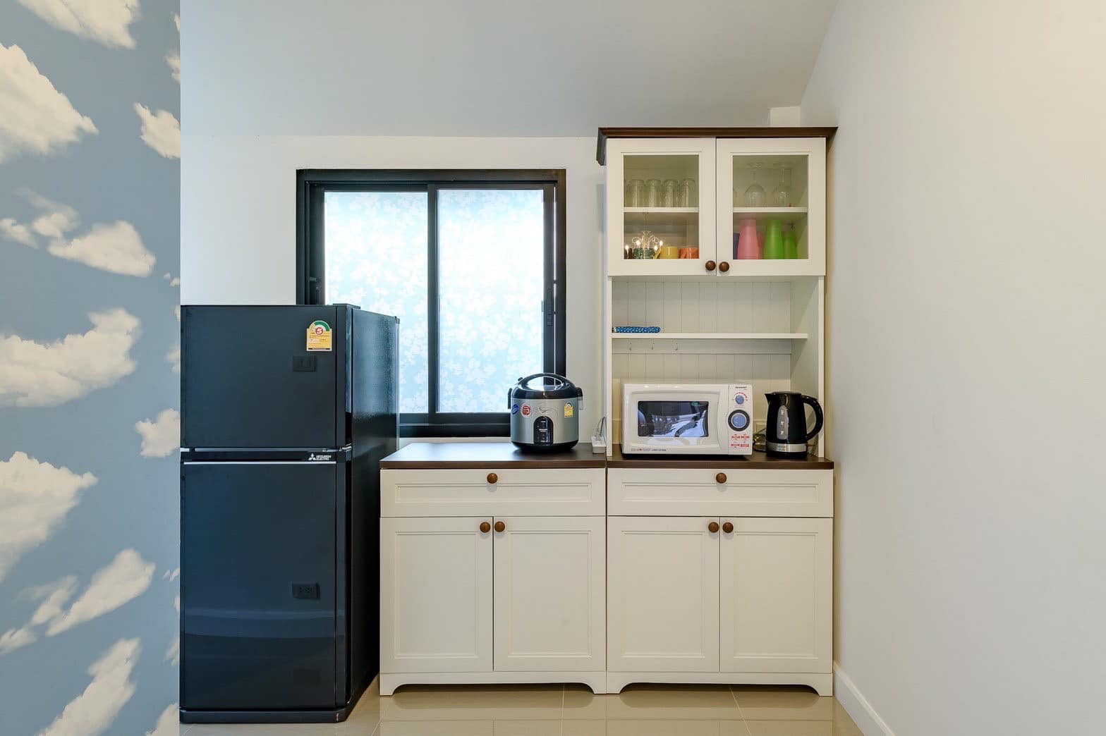 - ไมโครเวฟ, กาน้ำร้อน, หม้อหุงข้าว, ตู้เย็น, เครื่องปิ้งขนมปัง, เตาแก๊ส