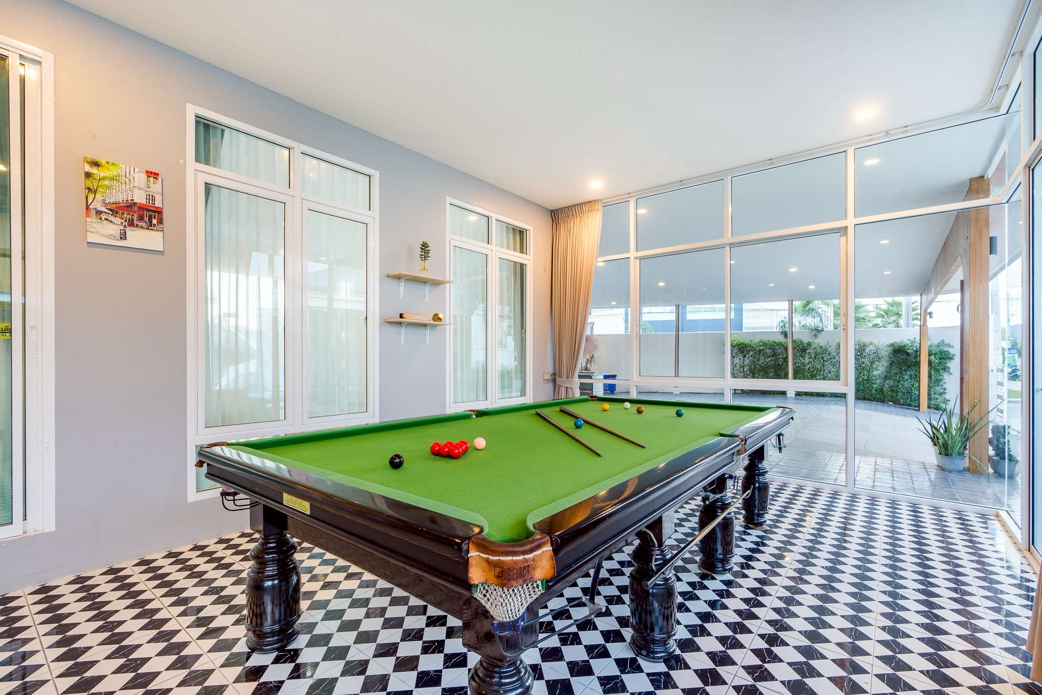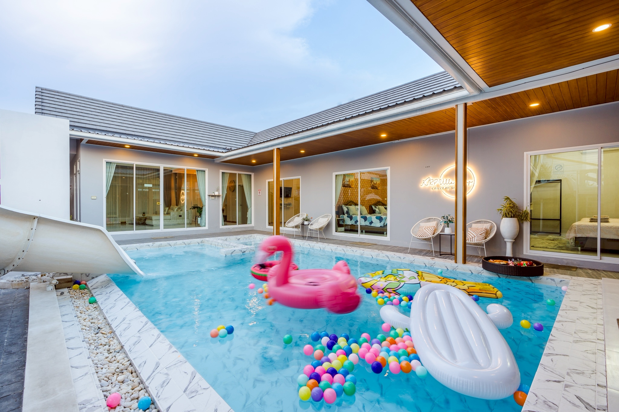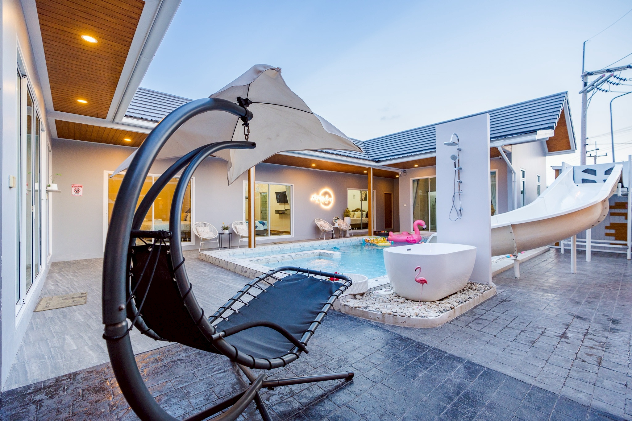 ไฮไลต์ของที่นี่คือสระว่ายน้ำส่วนตัว เล่นน้ำได้ทั้งวันแบบไม่ต้องแชร์กับใคร พร้อมโต๊ะสนุ๊กมาตรฐาน และคาราโอเกะเสียงจัดเต็ม เพิ่มความมันส์ให้ปาร์ตี้ยาวๆ ได้แบบไม่มีสะดุด แถมยังมีโซฟาเบดปรับนอนได้ และพรอพถ่ายรูปเก๋ๆ เอาใจสายคอนเทนต์อีกด้วยค่ะ