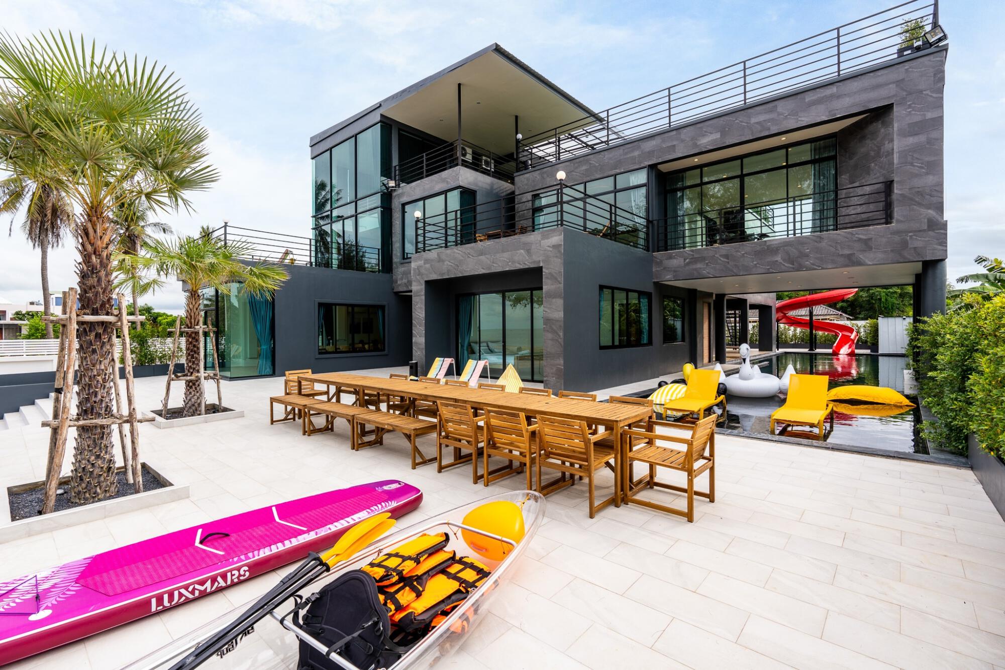 ไฮไลต์คือโลเคชันติดทะเลจริง มีสระว่ายน้ำส่วนตัว จากุชชี่ คาราโอเกะ โต๊ะพูล และสไลด์เดอร์ครบ แอร์ทั้งหลัง อุปกรณ์ครัว เตาปิ้งย่าง ที่จอดรถ และยังมีแม่บ้านดูแล เหมาะมากกับงานเลี้ยง ทริปบริษัท หรือปาร์ตี้ใหญ่ที่อยากได้บรรยากาศทะเลแบบจัดเต็มค่ะ