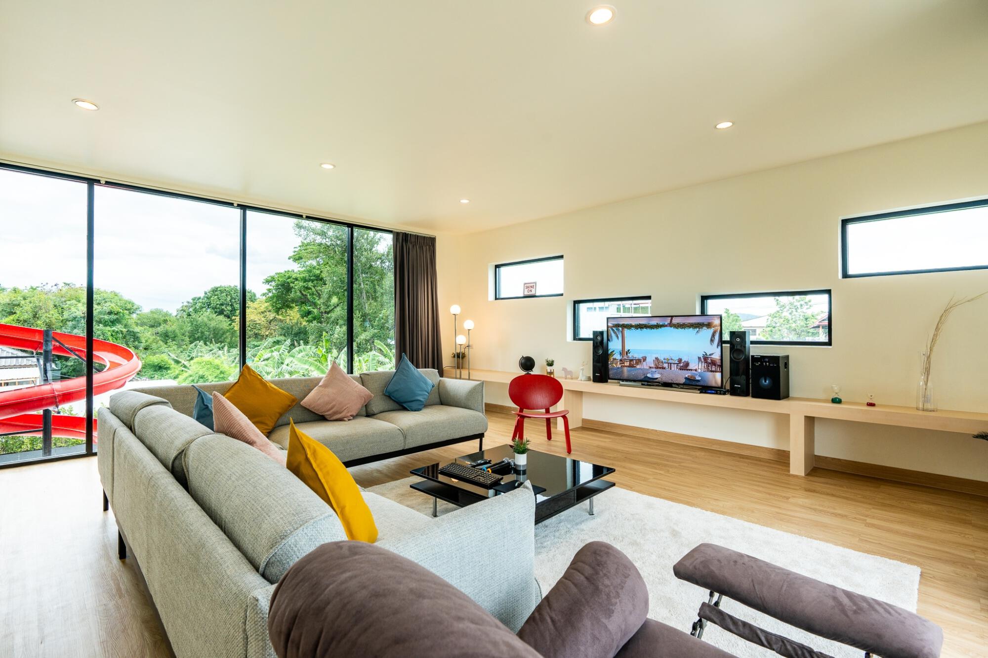 จุดเด่นคือสระว่ายน้ำระบบคลอรีนพร้อมสไลด์เดอร์ เพิ่มความสนุกให้ทริปนี้คึกคักขึ้นอีกระดับ เสริมด้วยโต๊ะพูล Smart TV เชื่อมต่อลำโพง จะเปิดเพลงหรือจัดปาร์ตี้ในบ้านก็ทำได้แบบชิลๆ อุปกรณ์ครัวครบ เตาปิ้งย่างพร้อม แถมยังเป็น Pet Friendly ใครอยากพาน้องหมาน้องแมวมาด้วย บ้านนี้ตอบโจทย์ค่ะ